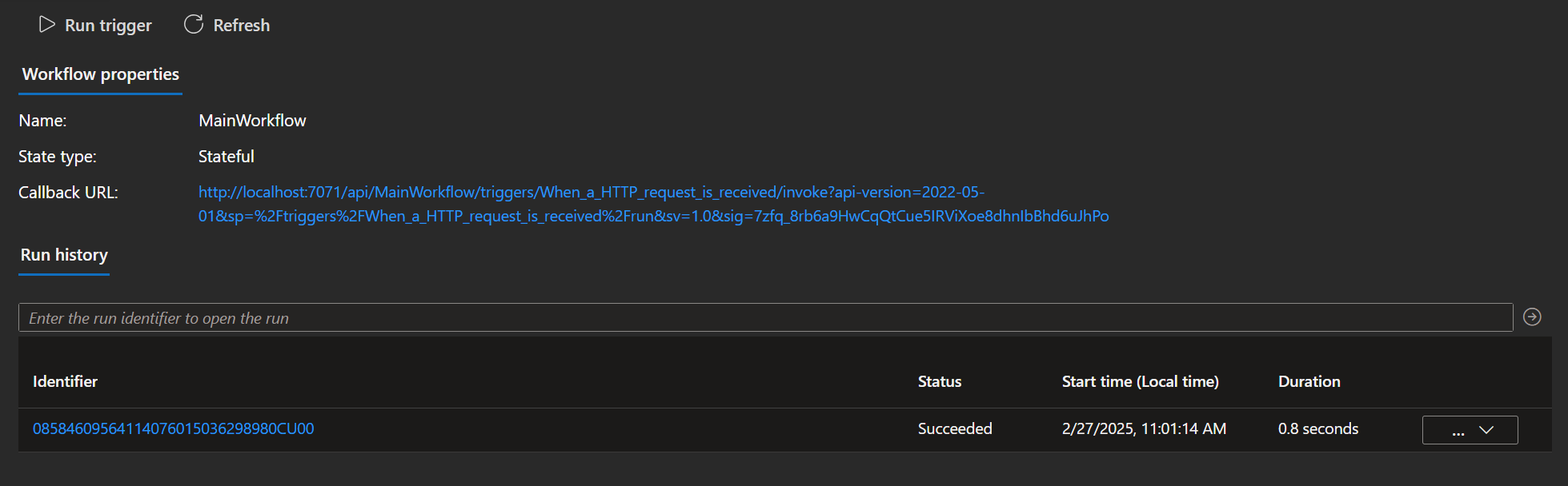 To run the workflow, activate the Azurite storage emulator for blobs, queues, and tables. Once that’s done, you can attach the debugger to both projects, selecting “Run/debug logic app with local function” from the Run and Debug list. Then, from the workflow’s overview page, you can run the trigger.