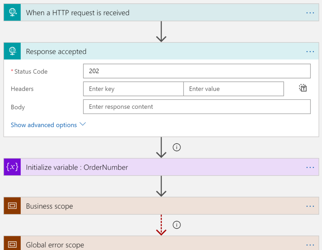 Notez que le code 202 signifie « Acceptée » dans la langue des codes Http. Si une Logic App appelle celle-ci, elle recevra une réponse 202 et continuera son exécution sans attendre la fin de la Logic App imbriquée. Le pattern est réellement très simple à implémenter, mais, dans le paragraphe suivant, je vous propose de le peaufiner.