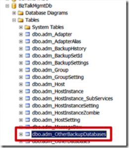 Afin que le job de backup BizTalk intègre la base EsbExceptionDb dans le processus de sauvegarde, vous devez simplement mettre à jour la table adm_OtherBackupDatabases de la base de données BizTalkMgmtDb :